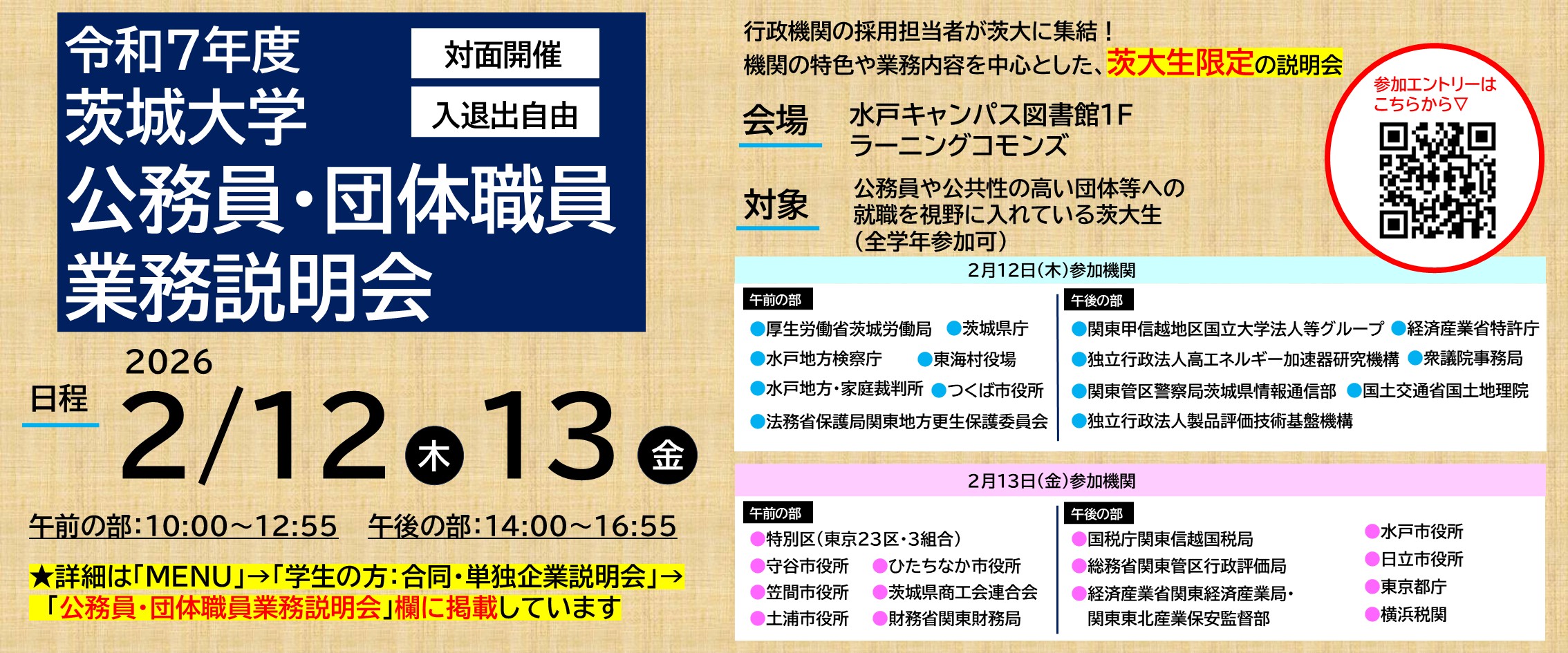| 令和8年2月12日(木)、13日(金)にキャリアセンター主催の「令和7年度茨城大学公務員・団体職員業務説明会」を開催します。 →【当日の詳細や参加機関】 →【参加エントリーフォーム】 |